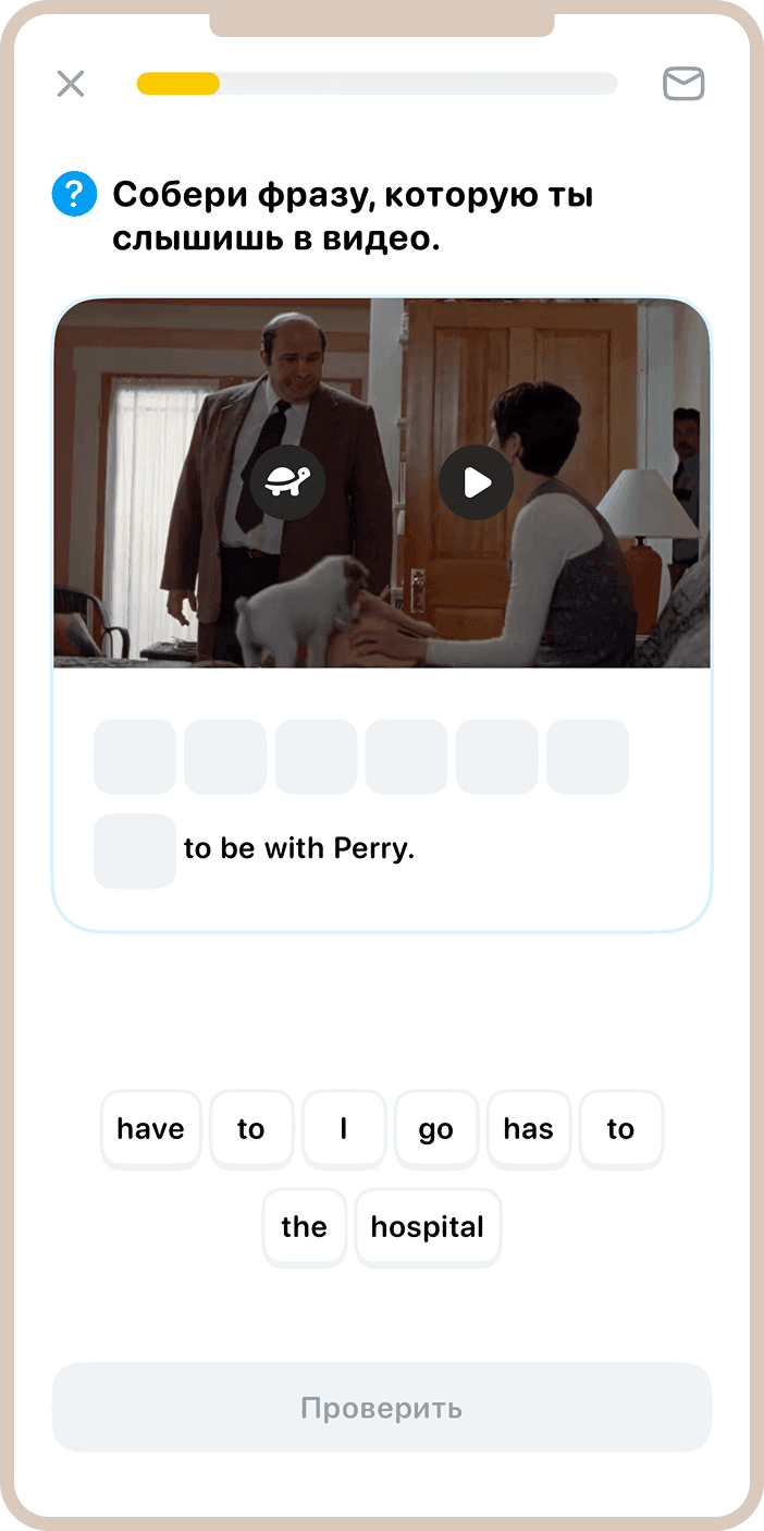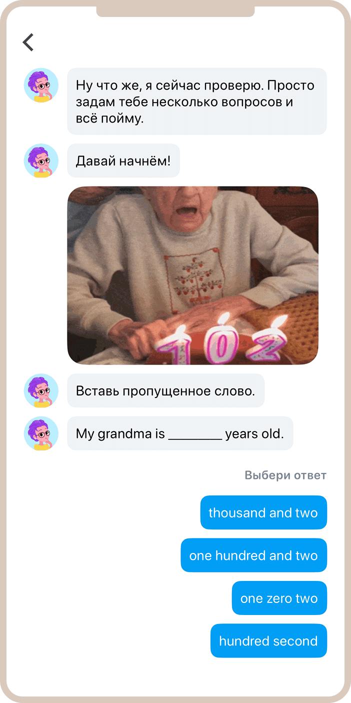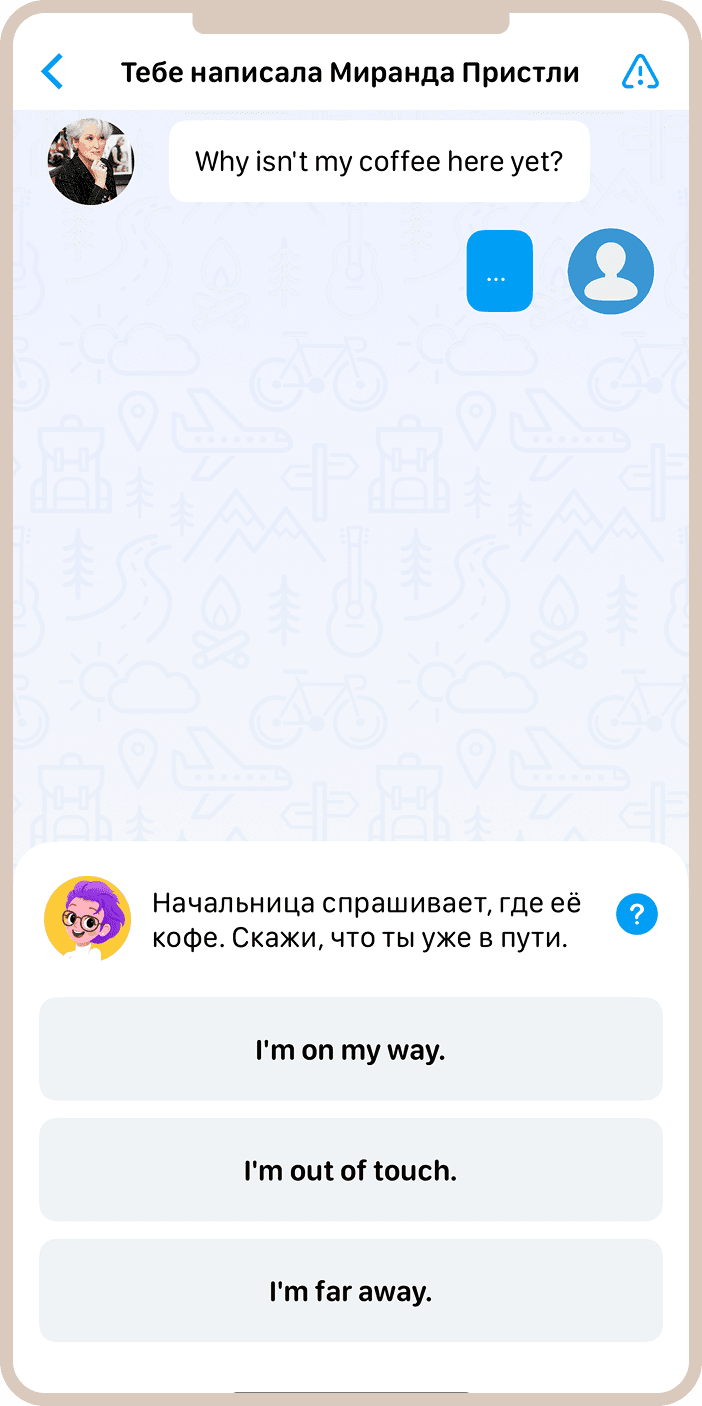 Необычная интерактивная функция, позволяющая практиковать разговорные навыки — это диалоги с персонажами из фильмов и сериалов в рамках изученных сценариев. Виртуальные герои периодически инициируют разговоры на изучаемом языке, предлагая пользователю вступить в дискуссию на различные темы. Для лучшего понимания контекста даются подсказки на русском, и ими можно воспользоваться в случае, если что-то не совсем непонятно или нужно перепроверить себя. Функция помогает развивать навыки восприятия языка и общения через контекстное обучение.