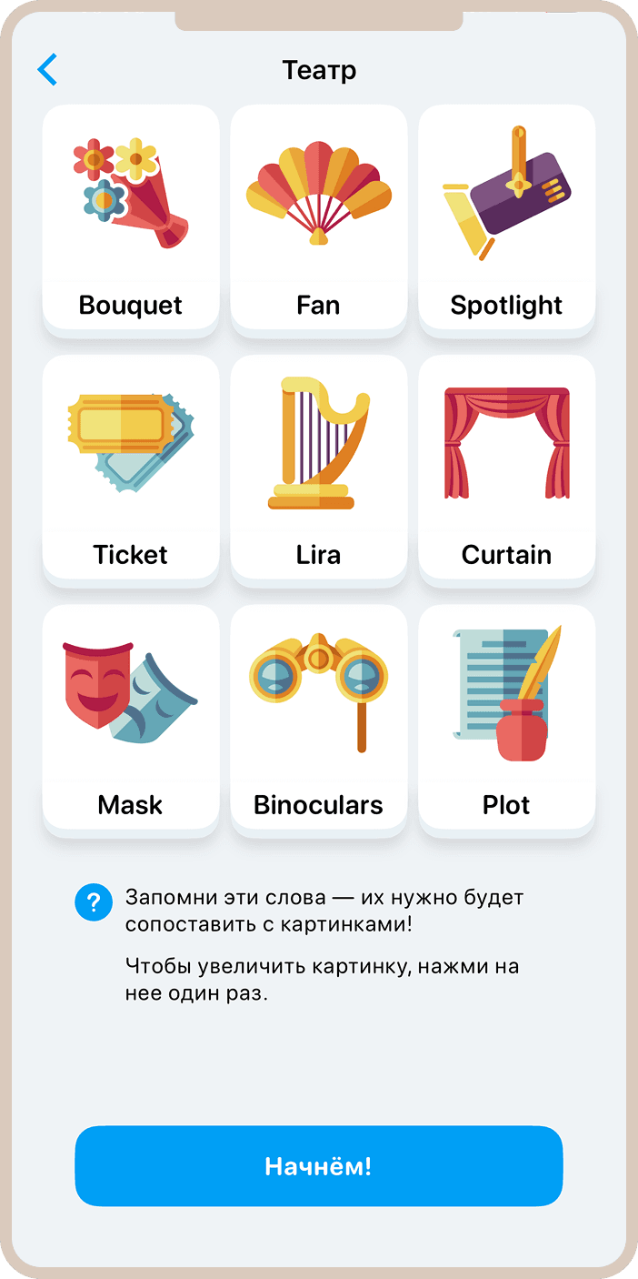 - Memento — игра, где нужно запоминать картинки и подставлять их к нужным словам. Это классическая игра на развитие зрительной памяти и ассоциативного мышления для изучения новой лексики.