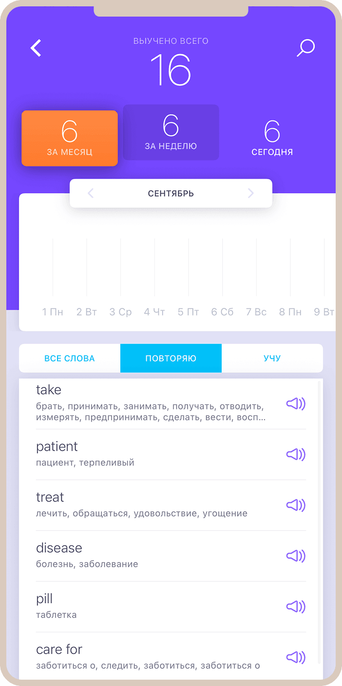 Приложение использует метод интервального повторения для закрепления слов, изученных через видео или книги. Карточки появляются в оптимальное время для повторения, что способствует переносу информации в долговременную память.