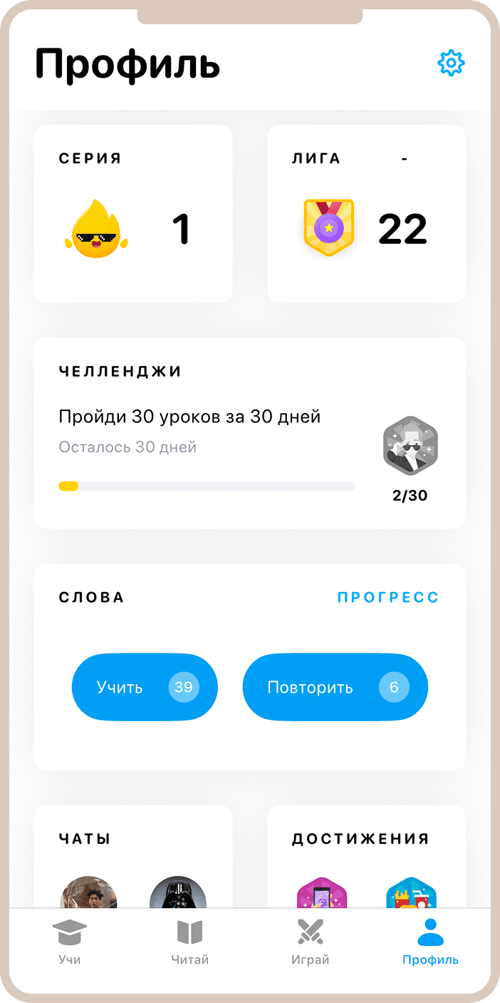 Система достижений мотивирует на регулярные занятия — можно получать награды за ежедневные занятия, изучение определенного количества слов или прохождение сложных уроков.