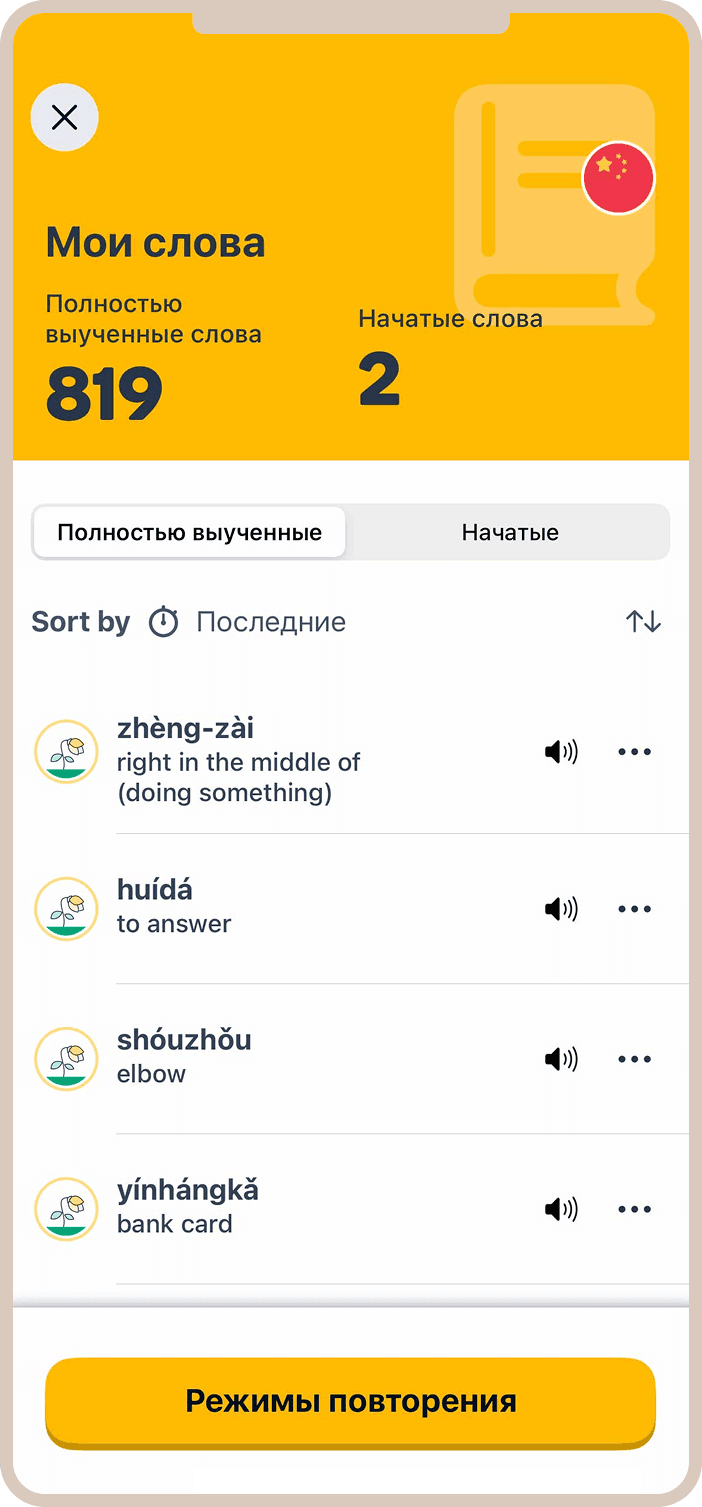 - Использовать режим «Повторение» регулярно, а не только фокусироваться на изучении новых слов — долговременное запоминание требует систематических повторений.