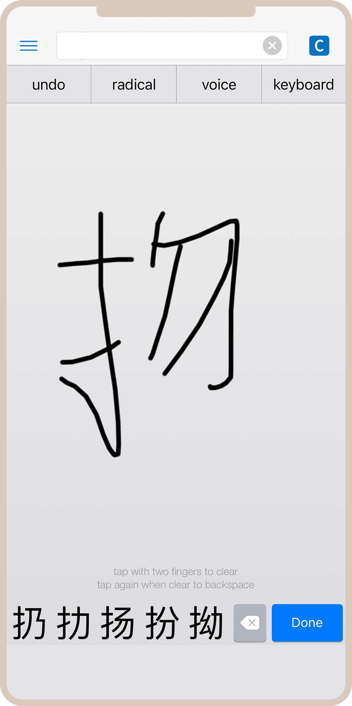 Распознавание рукописного ввода позволяет нарисовать иероглиф пальцем, если вы не знаете, как его произносить. Система довольно точно угадывает даже не очень аккуратно написанные знаки, что спасает в ситуациях, когда встречаешь незнакомый иероглиф в реальной жизни.