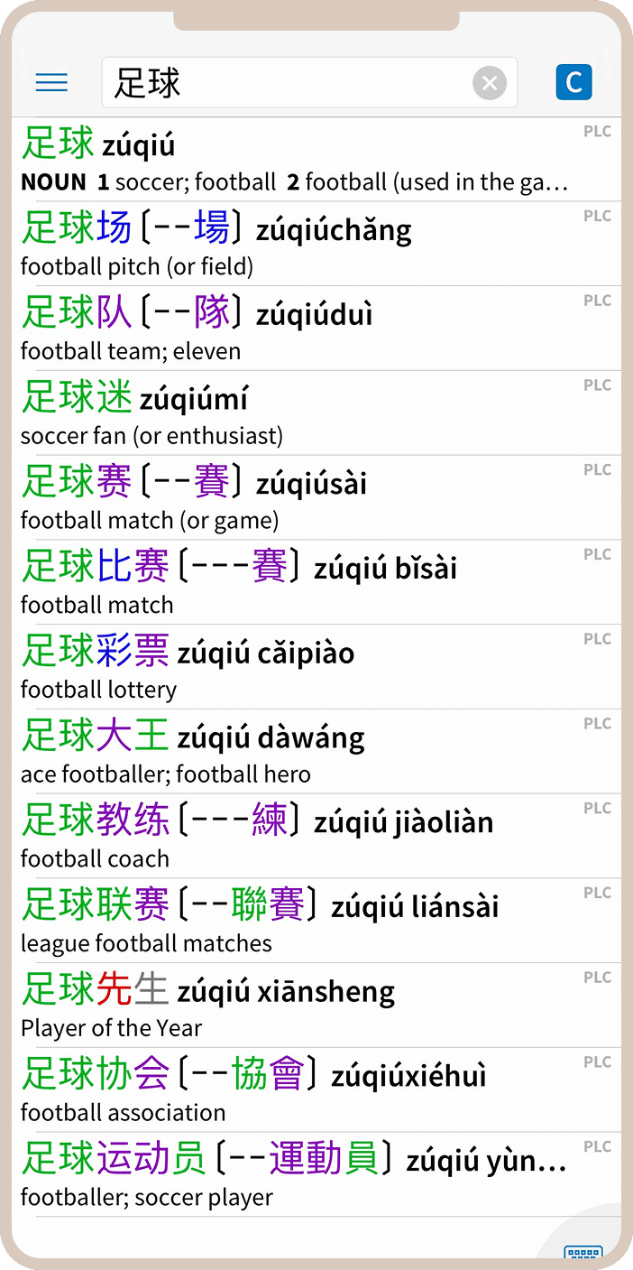 Система поиска в Pleco заслуживает отдельной похвалы. Здесь действительно продумано всё: можно искать слова на английском, на китайском (как в упрощенном, так и в традиционном написании), по пиньиню или даже по отдельным компонентам иероглифов.