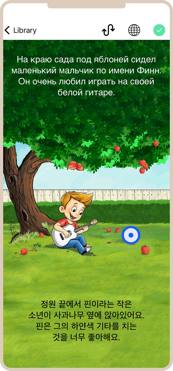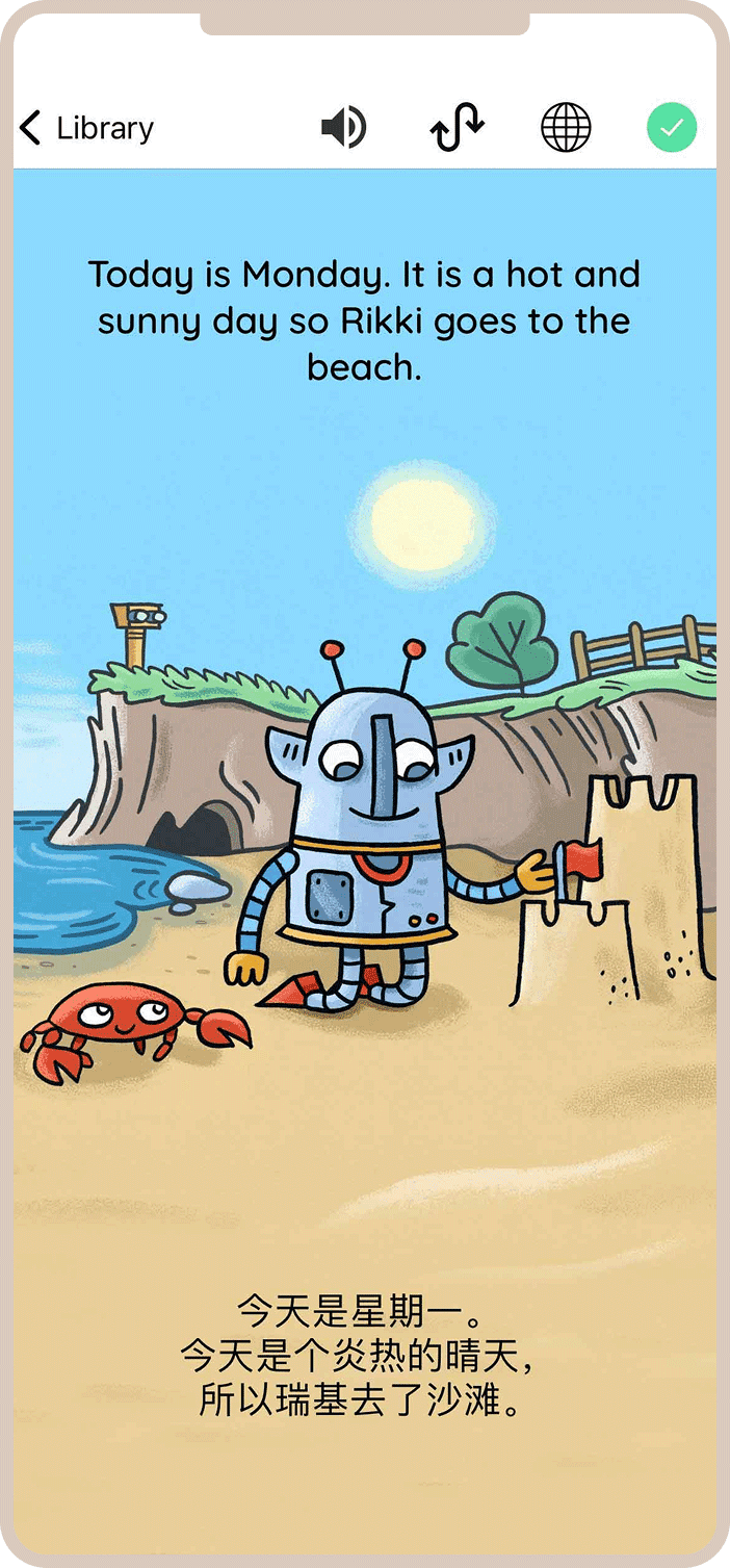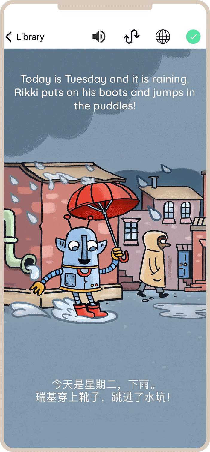 Unuhi — это приложение с библиотекой интерактивных книг, которые можно читать на двух языках одновременно. Выбираете любую пару из 20 доступных языков (английский, французский, испанский, китайский, арабский и другие) и читаете историю, где текст сразу отображается на обоих языках.