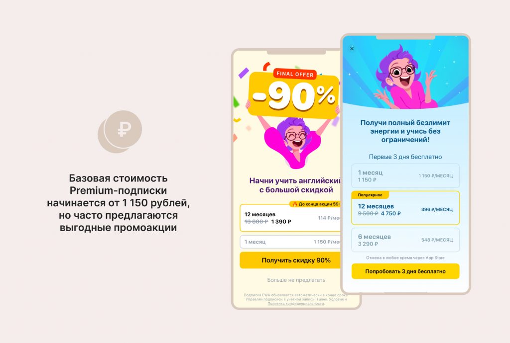 В бесплатной версии приложения уроки, книги и игры открываются за внутреннюю валюту — «молнии». Чтобы пройти занятие, понадобится 20 «молний», для чтения или прослушивания книги — 30 «молний», а для одного раунда мини-игры — всего 5. Валюта восстанавливается в течение дня — каждые 30 минут система начисляет 1 «молнию». Такое ограничение использования EWA без подписки.