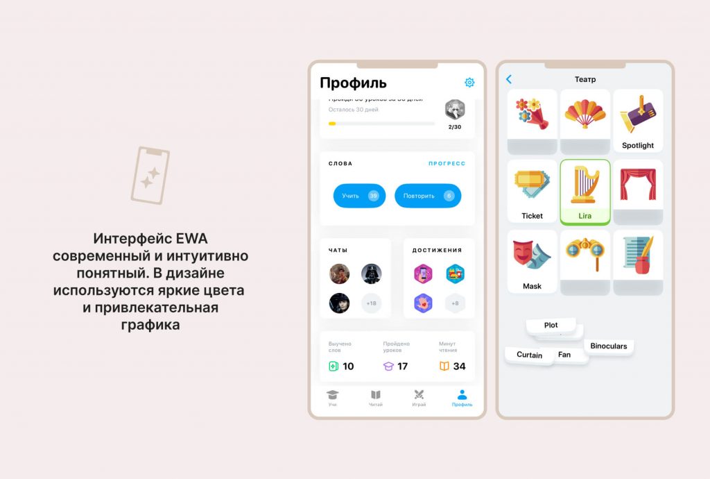 Интерфейс EWA выполнен в современном стиле с интуитивно понятной навигацией. Нижнее меню четко разделено на основные разделы: видеоуроки, книги, игры и профиль пользователя, в котором находятся настройки, повторение слов и статистика прогресса. Чтобы освоиться в приложении понадобится совсем немного времени.