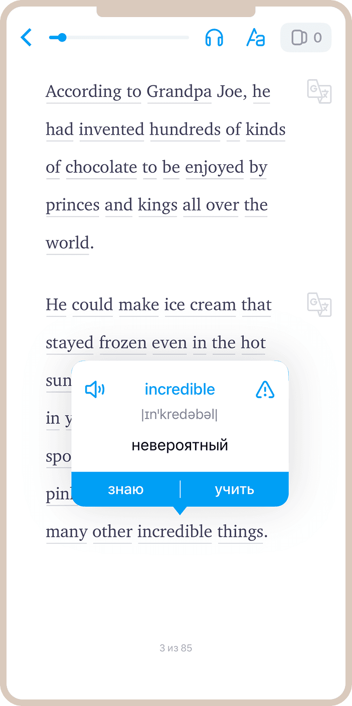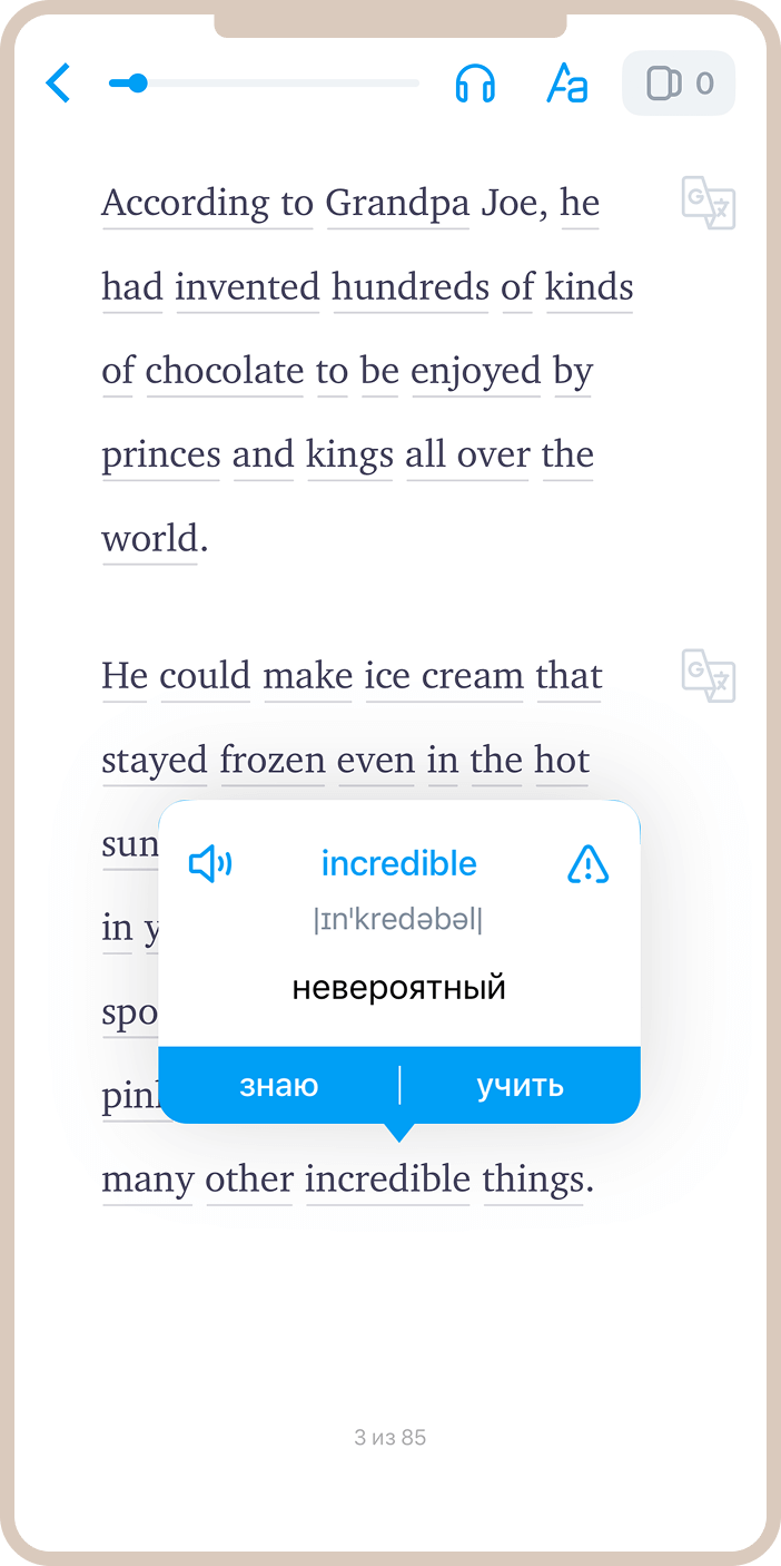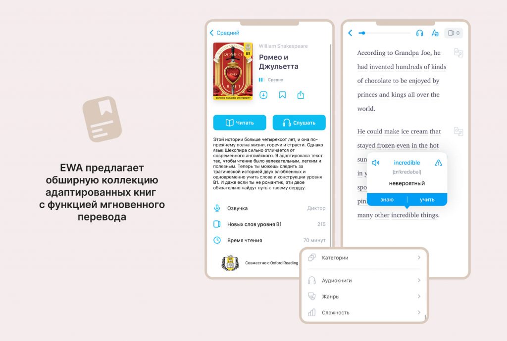 EWA предлагает обширную коллекцию адаптированных книг различных жанров и уровней сложности. Функция мгновенного перевода позволяет одним касанием получить значение любого слова или предложения, не прерывая процесс чтения. А еще слова можно добавлять в карточки для изучения и повторения.