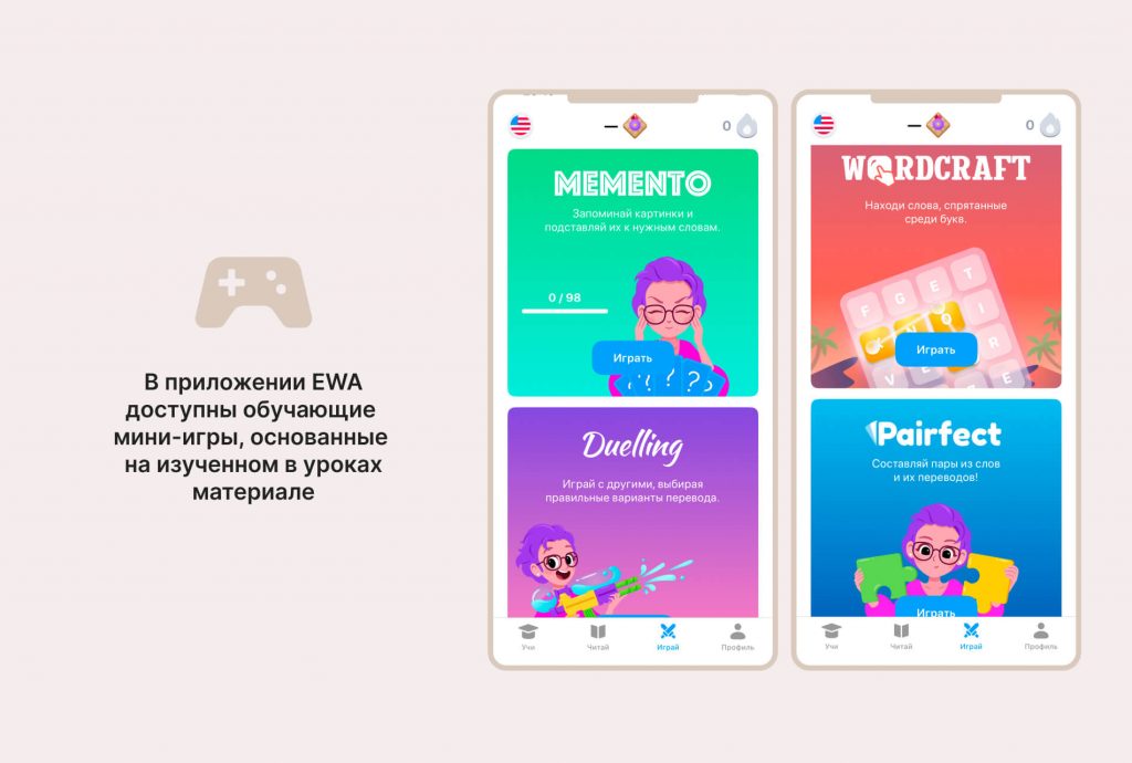 В приложении доступны развлекательно-обучающие мини-игры, основанные на изученном в уроках материале: