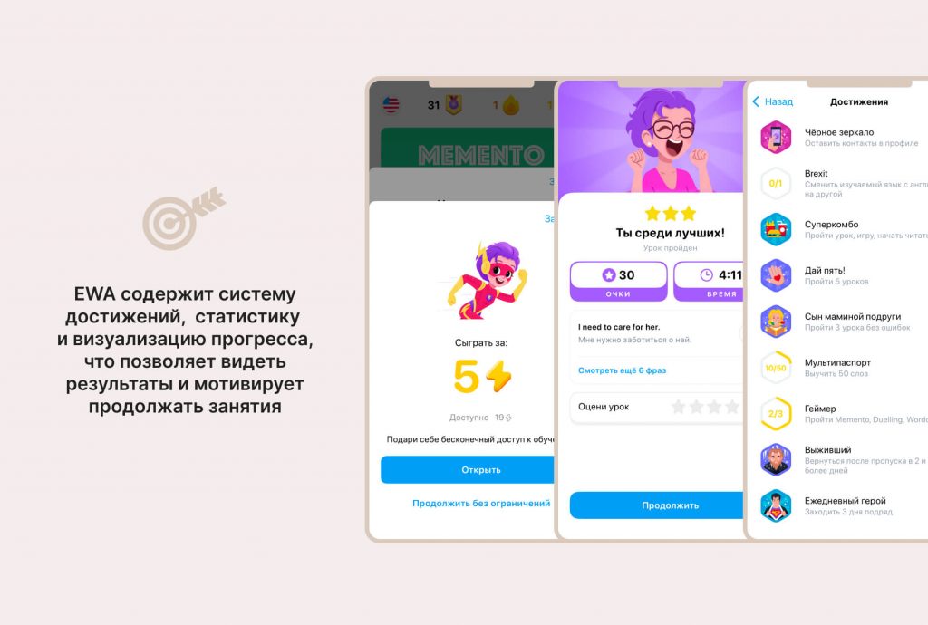 Система достижений мотивирует на регулярные занятия — можно получать награды за ежедневные занятия, изучение определенного количества слов или прохождение сложных уроков.