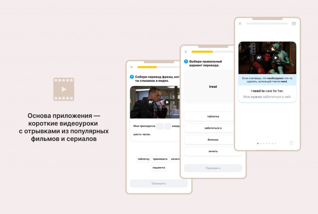Основа приложения — библиотека отрывков из фильмов и сериалов. Каждый урок строится вокруг определенной темы, где вы сначала смотрите отрывок, затем разбираете новые слова и фразы, которые сопровождаются примерами использования в различных ситуациях, что помогает понять не только значение, но и контекст употребления.