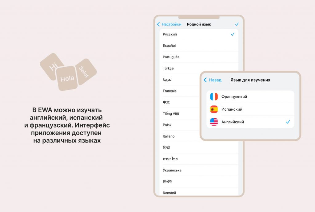 Для изучающих английский EWA доступно на нескольких языках, включая русский, испанский, китайский, немецкий, французский, польский, арабский, португальский и другие. Выбор языков приложения для изучения французского и испанского ограничен, но также имеется русскоязычная версия.