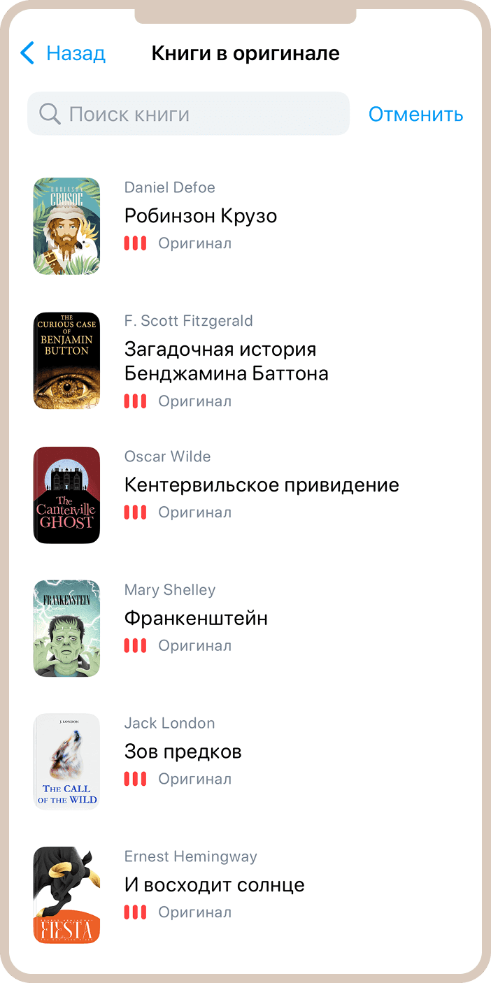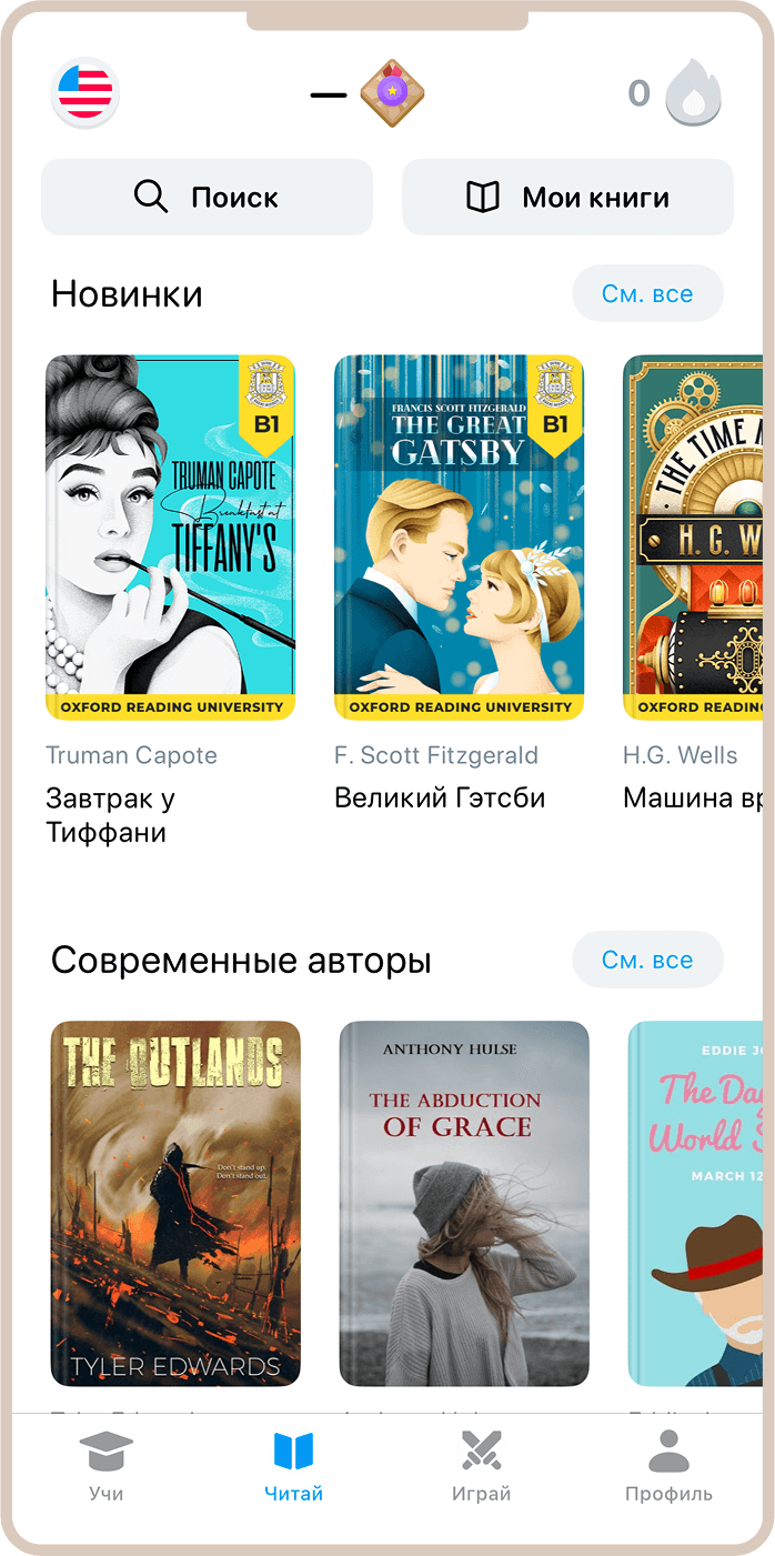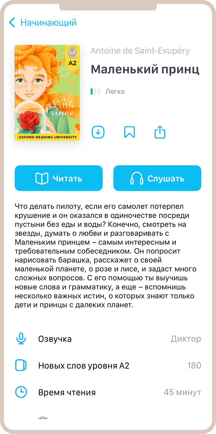 Книги разделены по уровням сложности, что позволяет постепенно повышать навыки чтения. Система отслеживает ваш прогресс и рекомендует произведения подходящего уровня. В приложении также доступно прослушивание книг.