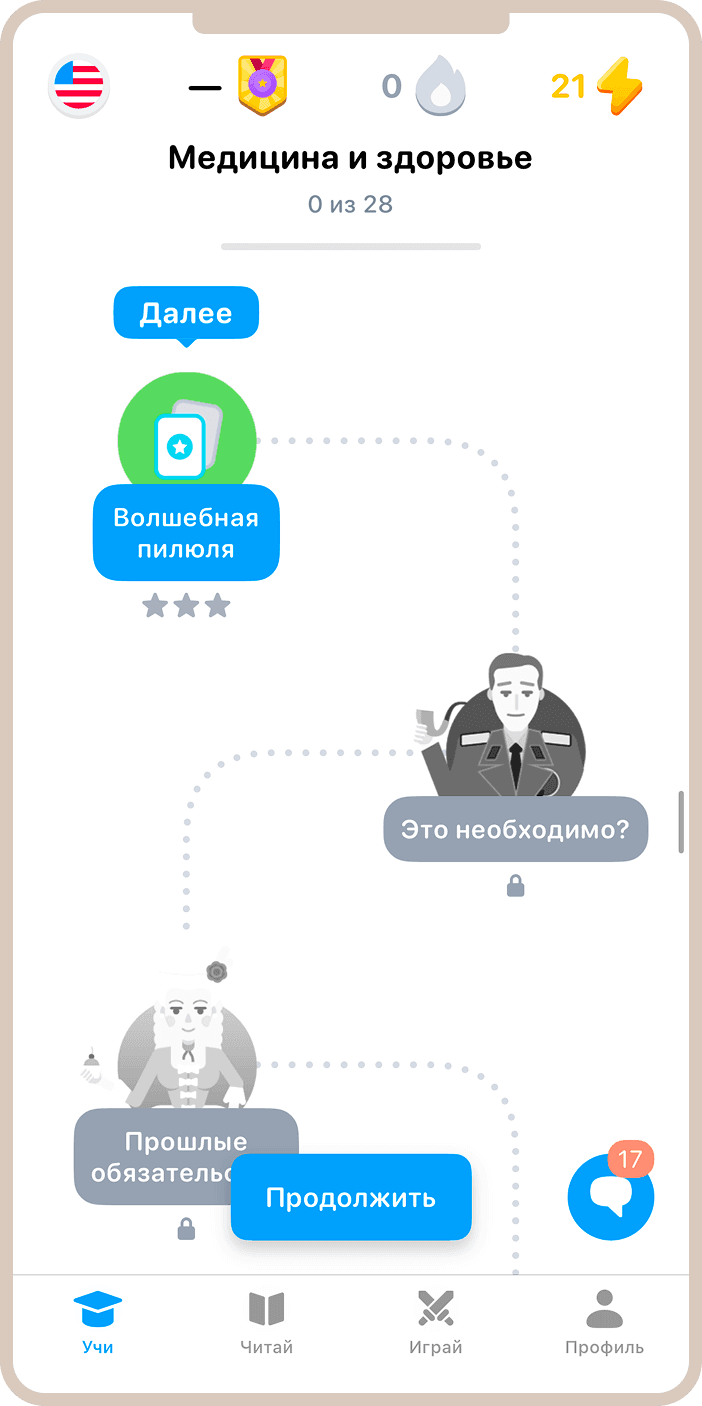 Приложение использует систему «стриков» (последовательных дней занятий), которая мотивирует не пропускать уроки. Ежедневные напоминания настраиваются с учетом вашего расписания и предпочтений.