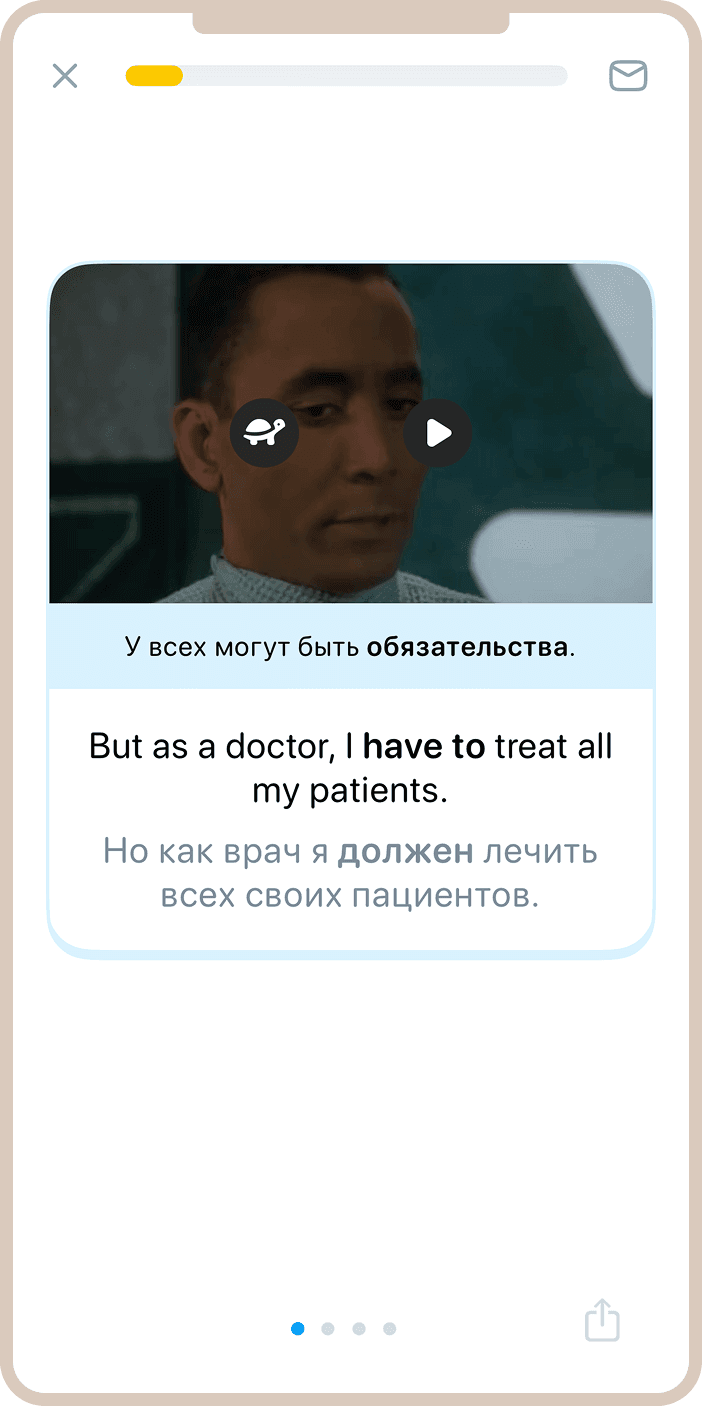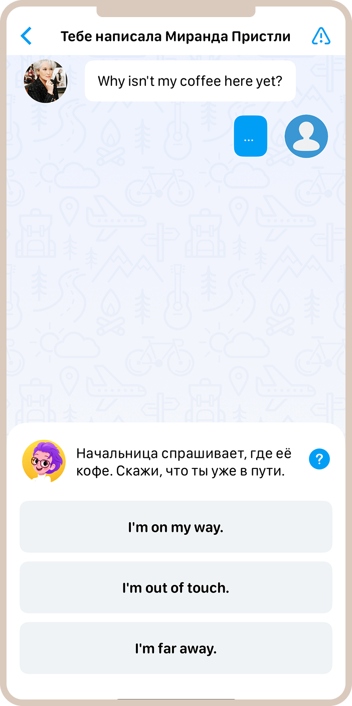 Необычная интерактивная функция, позволяющая практиковать разговорные навыки — это диалоги с персонажами из фильмов и сериалов в рамках изученных сценариев. Виртуальные герои периодически инициируют разговоры на изучаемом языке, предлагая пользователю вступить в дискуссию на различные темы. Для лучшего понимания контекста даются подсказки на русском, и ими можно воспользоваться в случае, если что-то не совсем непонятно или нужно перепроверить себя. Функция помогает развивать навыки восприятия языка и общения через контекстное обучение.