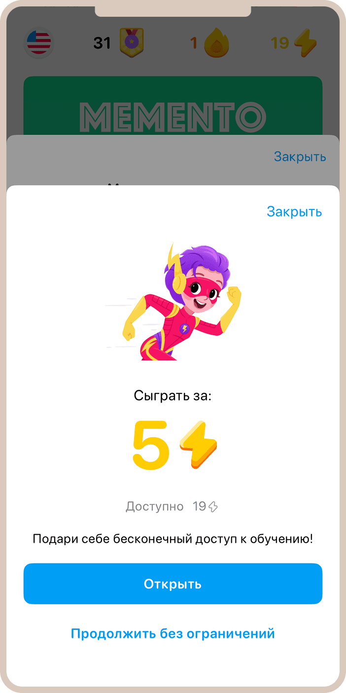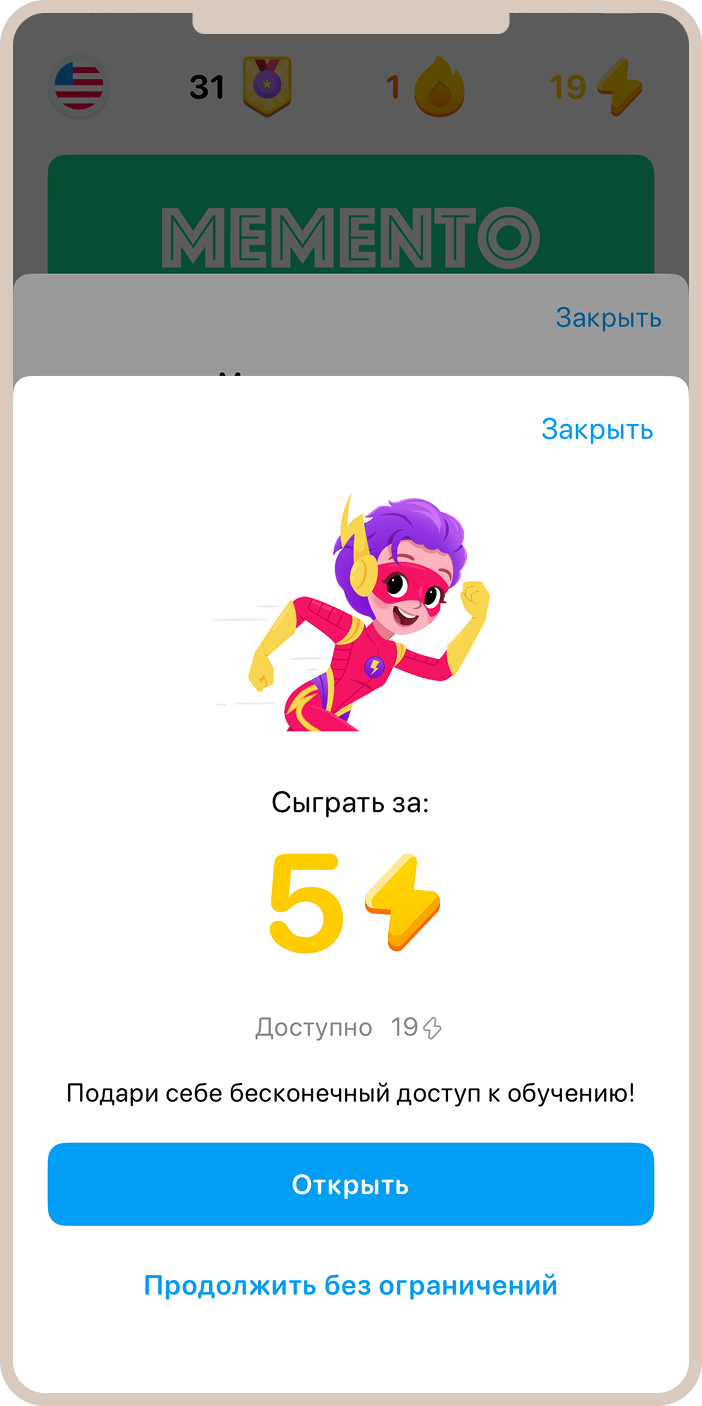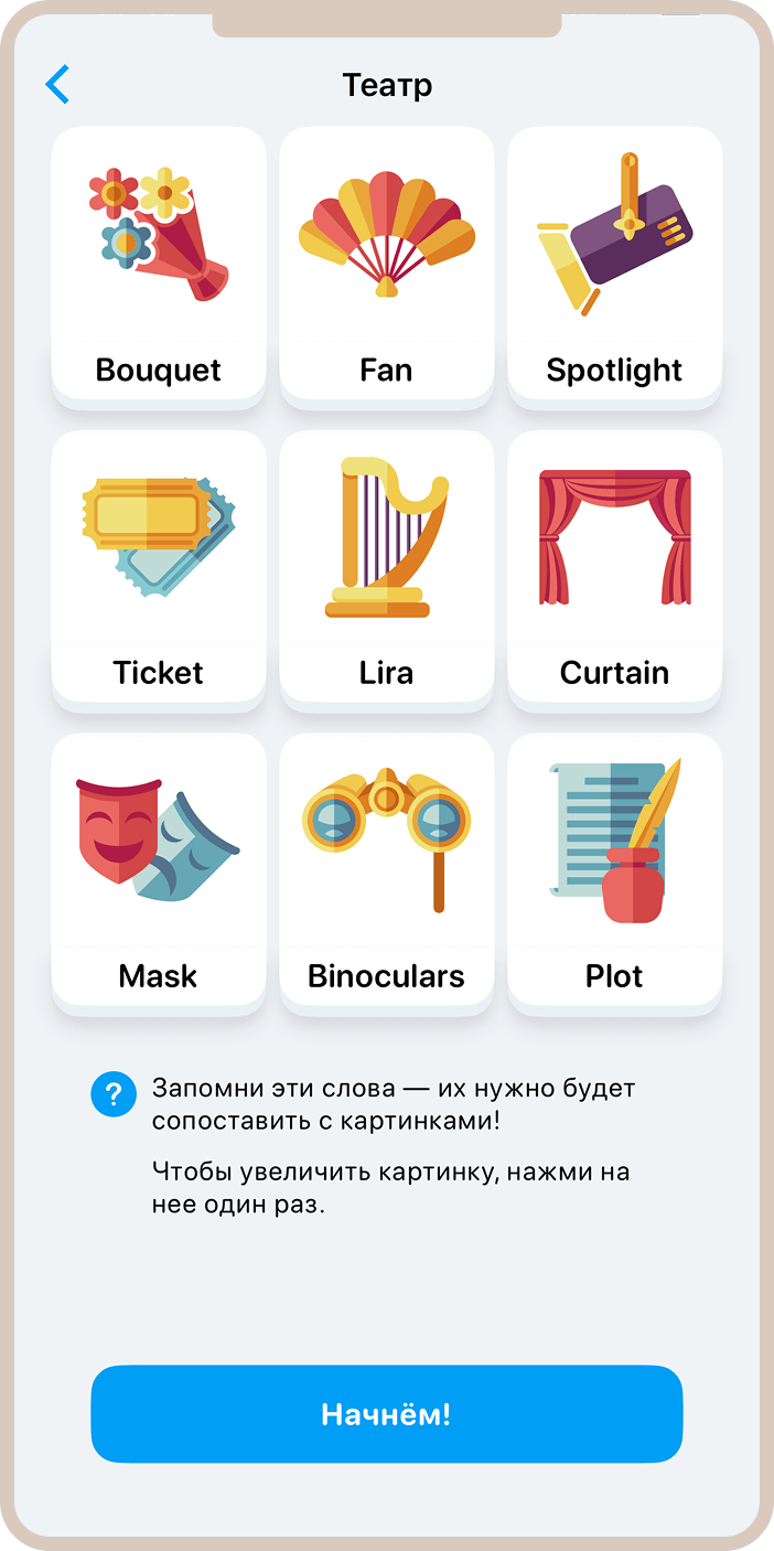 - Memento — игра, где нужно запоминать картинки и подставлять их к нужным словам. Это классическая игра на развитие зрительной памяти и ассоциативного мышления для изучения новой лексики.