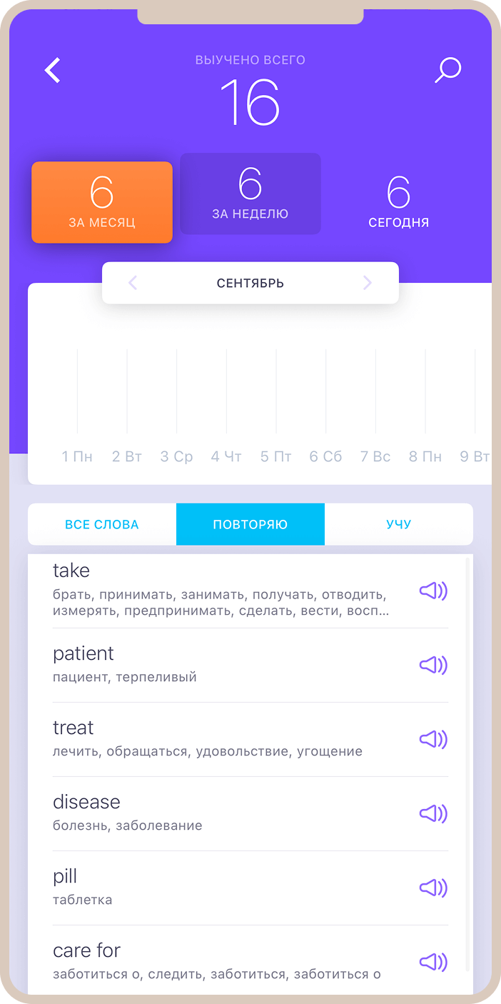 Приложение использует метод интервального повторения для закрепления слов, изученных через видео или книги. Карточки появляются в оптимальное время для повторения, что способствует переносу информации в долговременную память.