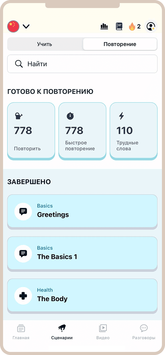 - Использовать режим «Повторение» регулярно, а не только фокусироваться на изучении новых слов — долговременное запоминание требует систематических повторений.