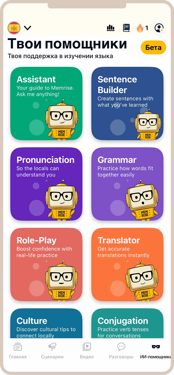 Однако отсутствие структурированной грамматики и ограниченность форматов практики делают Memrise неполноценным инструментом для комплексного изучения языка. Приложение лучше всего подходит для начинающих и продолжающих (до уровня B1), которые хотят расширить словарный запас и улучшить восприятие речи на слух в естественных условиях.