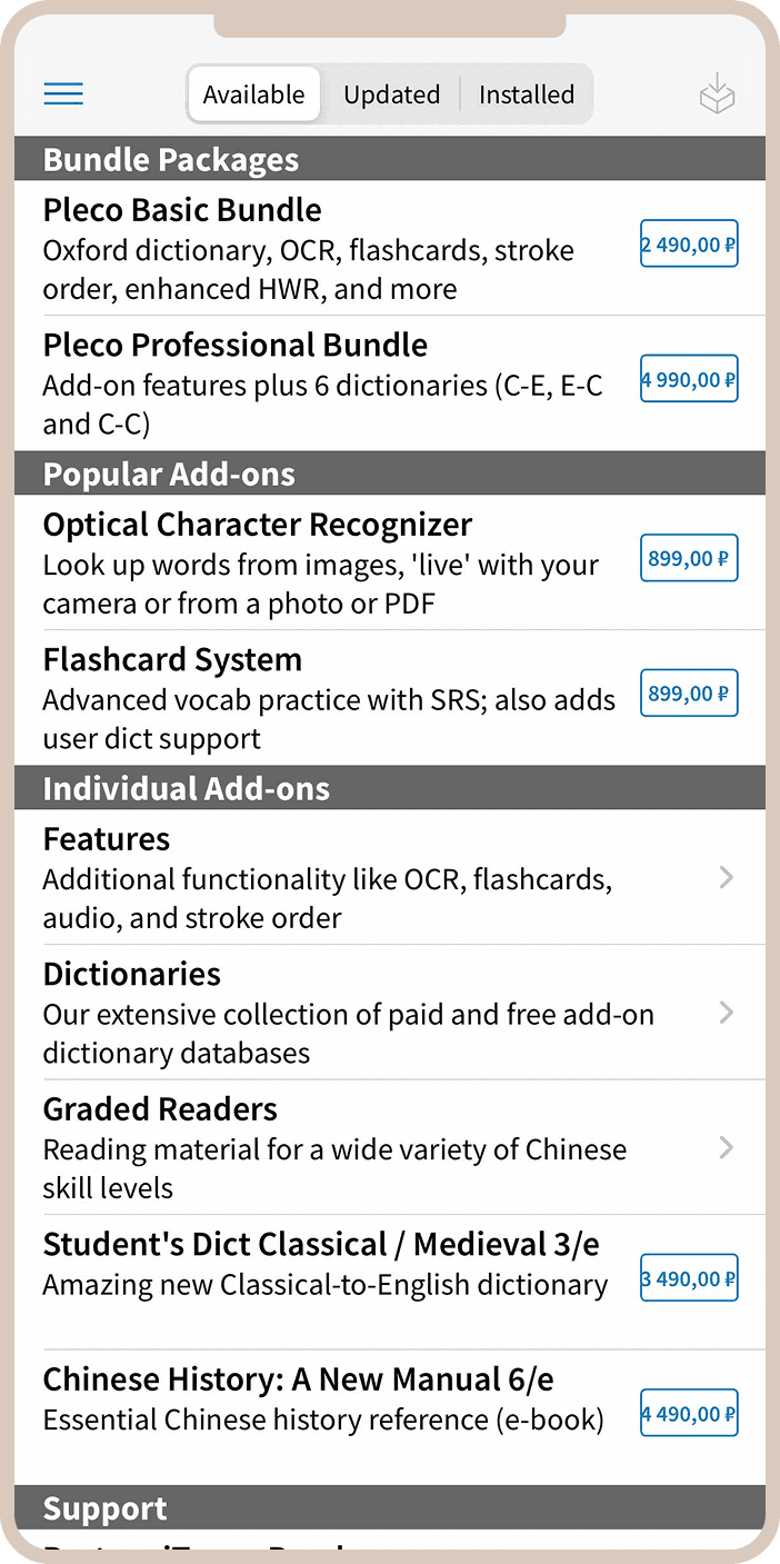 Важно отметить, что однажды купленные дополнения остаются с вами навсегда — без ежемесячных подписок или скрытых платежей. Это выгодно отличает Pleco от многих современных приложений, работающих по модели подписки.