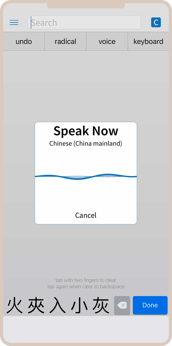 Распознавание рукописного ввода позволяет нарисовать иероглиф пальцем, если вы не знаете, как его произносить. Система довольно точно угадывает даже не очень аккуратно написанные знаки, что спасает в ситуациях, когда встречаешь незнакомый иероглиф в реальной жизни.