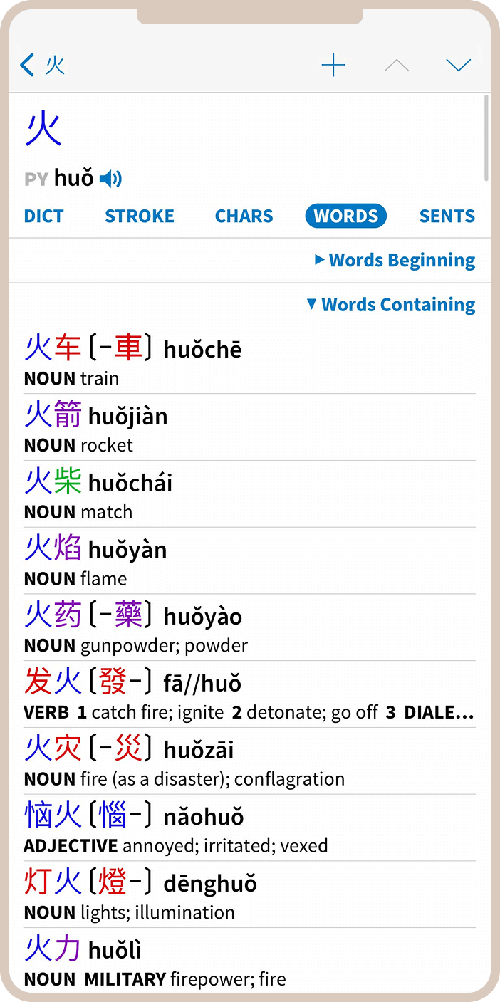 Система поиска в Pleco заслуживает отдельной похвалы. Здесь действительно продумано всё: можно искать слова на английском, на китайском (как в упрощенном, так и в традиционном написании), по пиньиню или даже по отдельным компонентам иероглифов.