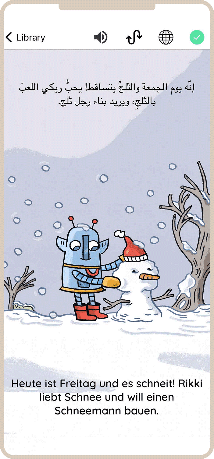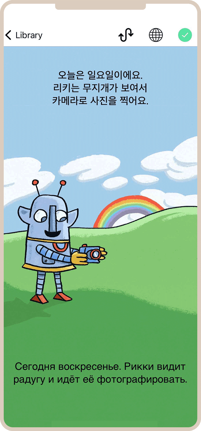 Unuhi — это приложение с библиотекой интерактивных книг, которые можно читать на двух языках одновременно. Выбираете любую пару из 20 доступных языков (английский, французский, испанский, китайский, арабский и другие) и читаете историю, где текст сразу отображается на обоих языках.